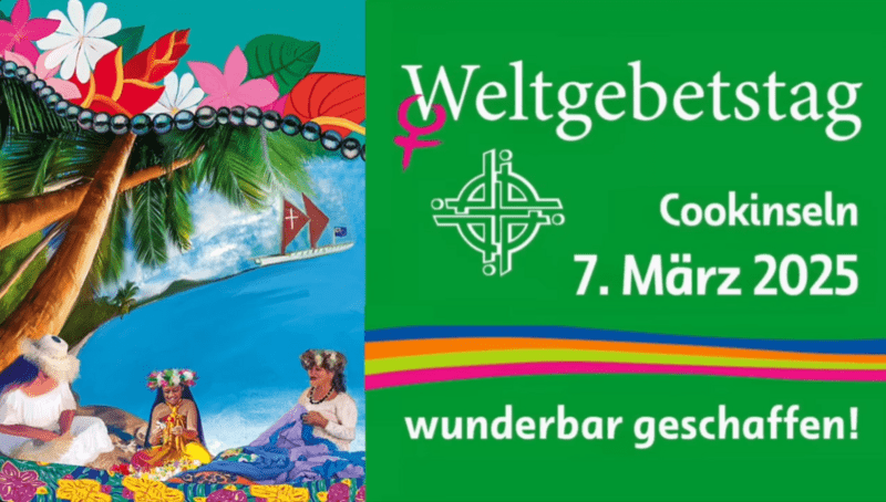Der Weltgebetstag von den Cookinseln wurde am Freitag, den 7. März 2025 in vielen ökumenischen Gottesdiensten rund um den Erdball gefeiert. Verantwortlich für die Gottesdienstordnung sind für 2025 christliche Frauen von den Cookinseln, einer Inselkette im Südpazifik. Die Christinnen der sehr kleinen und weit verstreut liegenden Inseln stellen den Psalm 139 ins Zentrum ihres Gottesdienstes. Sie luden ein, die Wunder der Schöpfung zu sehen und ihnen nachzuspüren und die Freude darüber zu teilen.