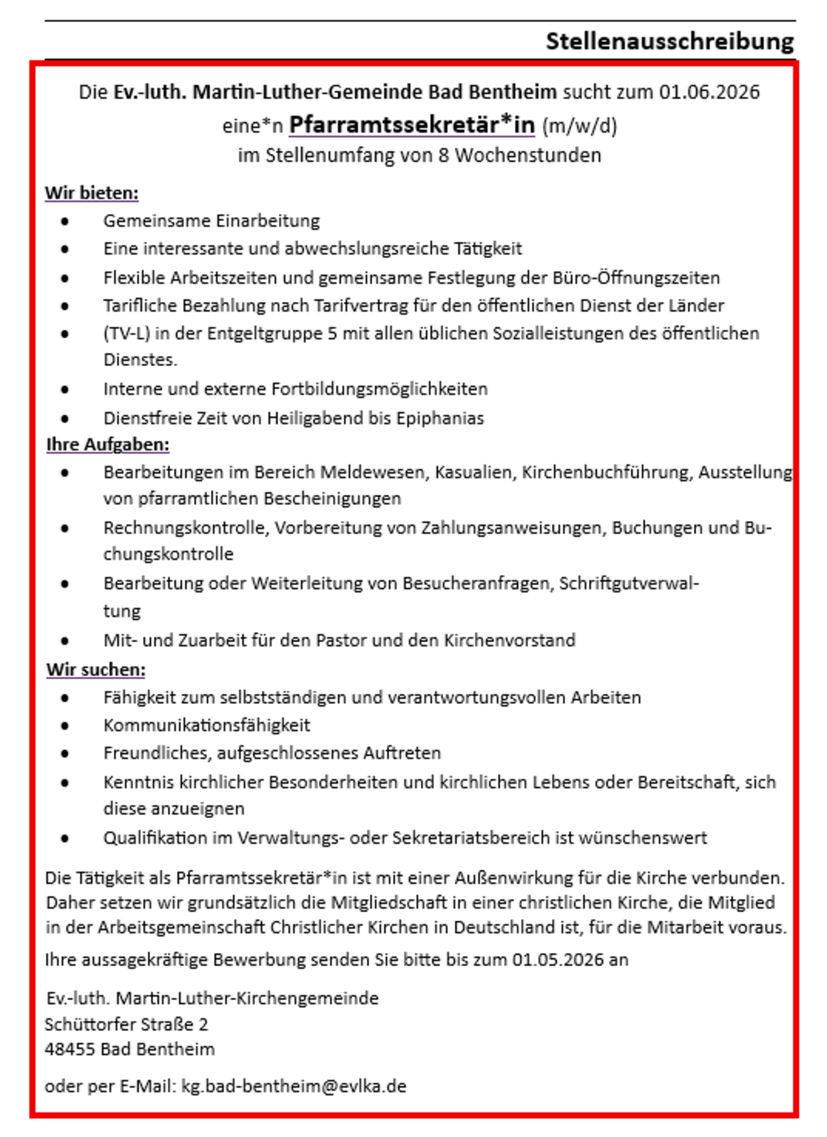 Seit dem 1.1.2021 bildet die Martin-Luther-Gemeinde Bad Bentheim zusammen mit den Gemeinden Schüttorf, Spelle und Emsbüren-Salzbergen.die pfarramtliche Verbindung Südliches Emsland - Obergrafschaft.